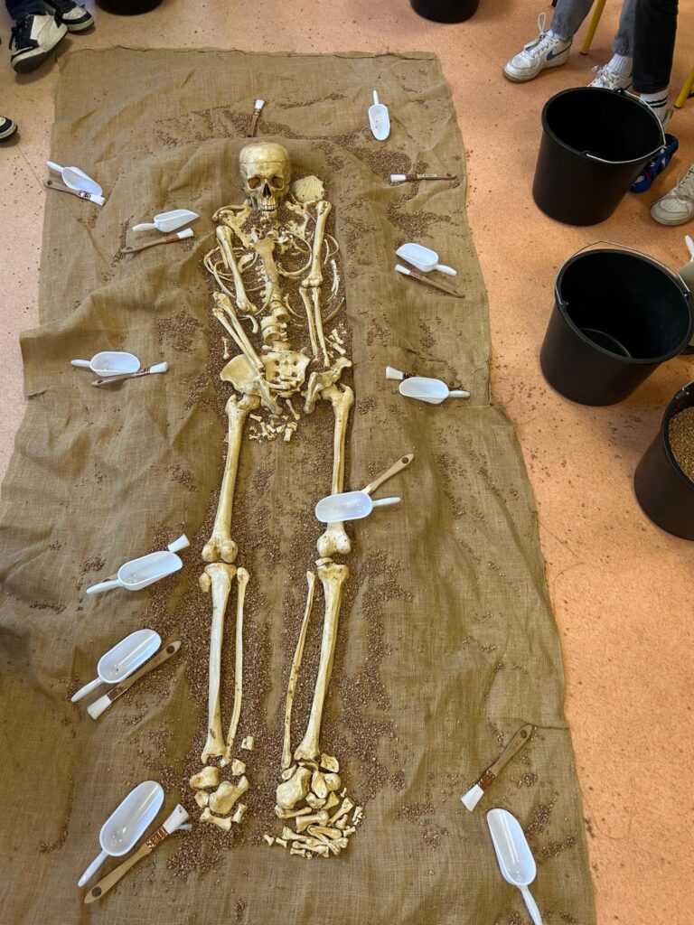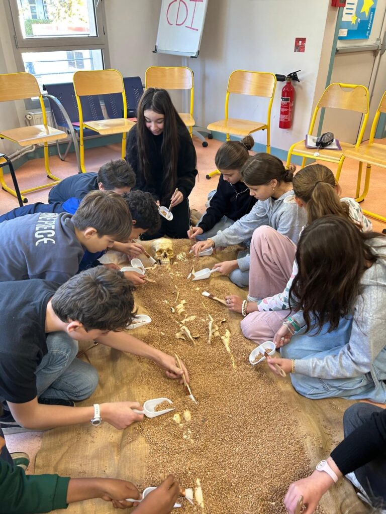 Après avoir écouté la présentation du métier d’archéologue et de l’association, les élèves ont fait un atelier fouilles et découvrir des outils archéologiques. Grâce à leurs trouvailles et recherches, ils ont pu dresser le portrait du squelette étudié celui d’un pèlerin parti pour Saint-Jacques-de-Compostelle. En parallèle, ils ont aussi mené une activité découverte sur l’art roman et l’art gothique pour un futur projet.