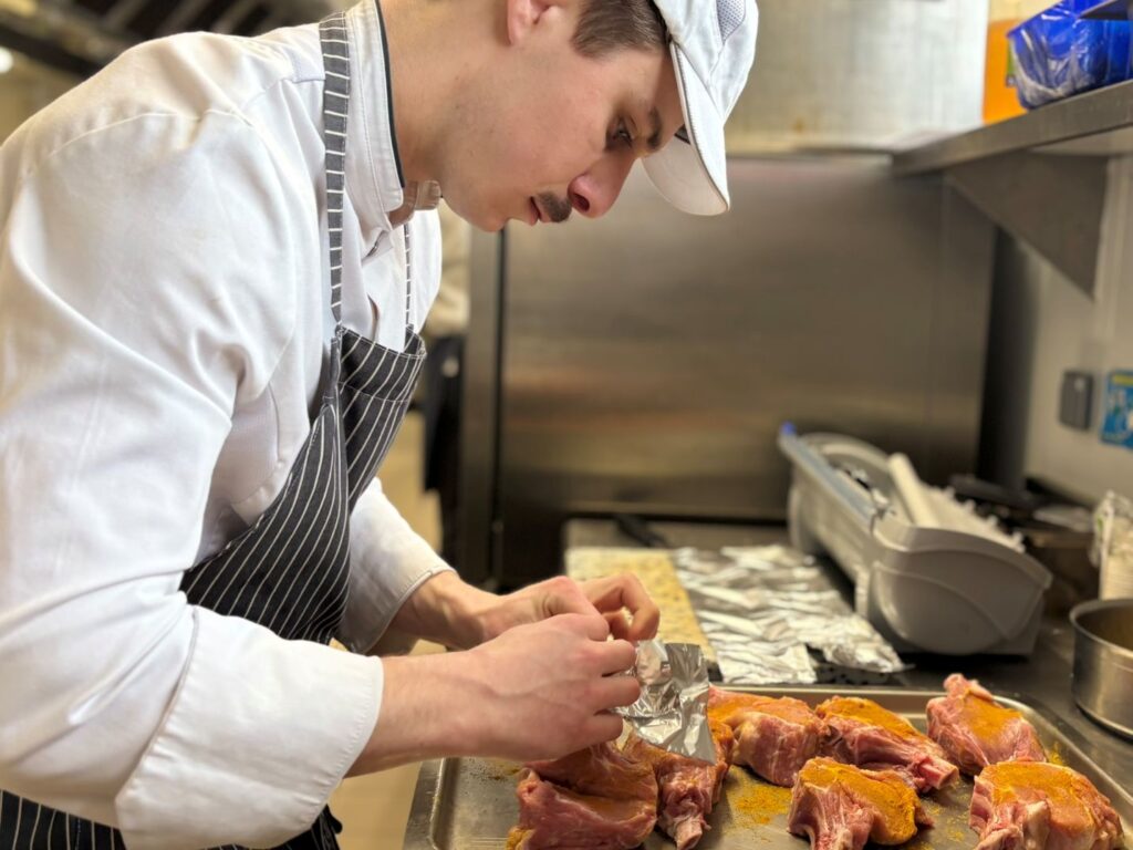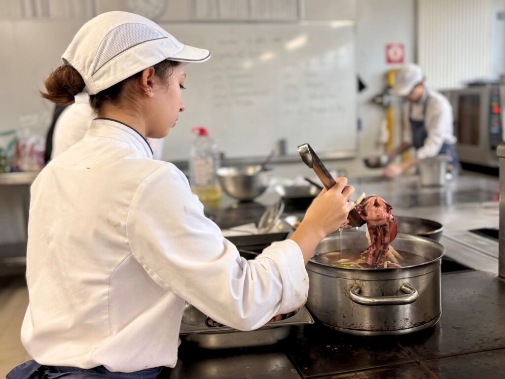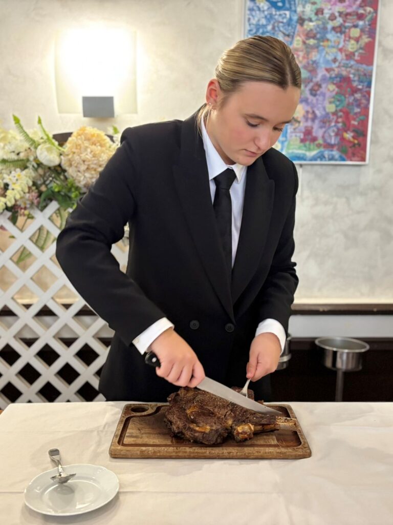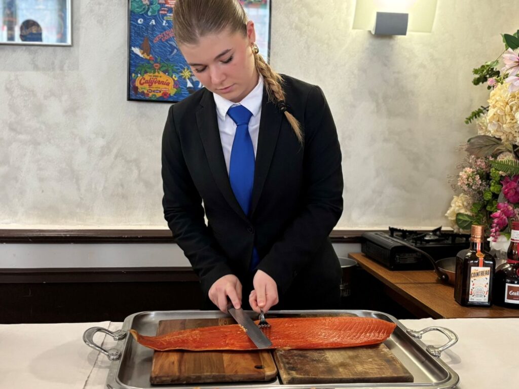 Côté service, les élèves ont été évalués sur plusieurs épreuves techniques : réalisation d’un cocktail sans alcool, découpes de saumon fumé, de côte de bœuf et de fromage, ainsi que le flambage. En cuisine, chacun devait faire preuve de créativité en réalisant une réduction salée à partir d’ingrédients tirés au sort, donnant lieu à des associations originales et maîtrisées.