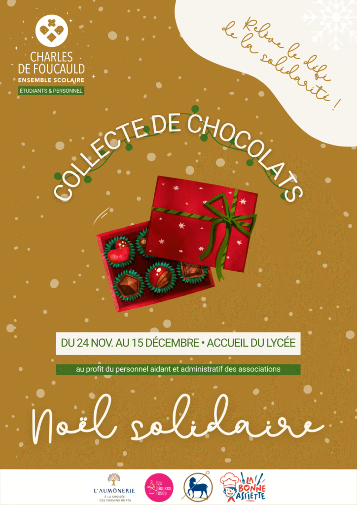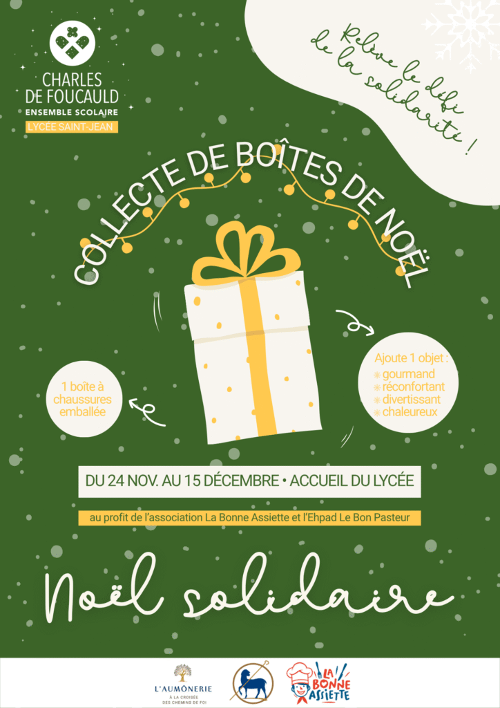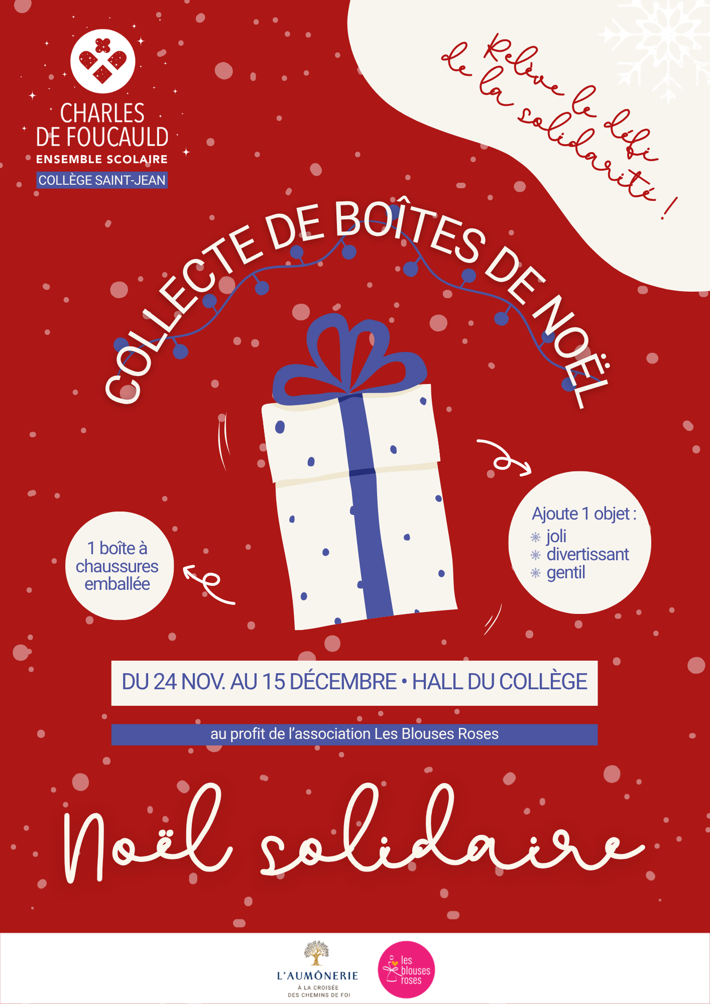 Cette opération de Noël solidaire est l’occasion de partager un geste simple mais précieux en cette période de fête : nous remercions chaleureusement toutes les familles, élèves et personnels qui contribueront à cette action collective !